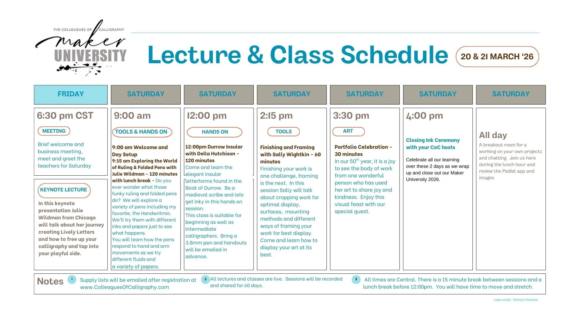 We will also send any associated “handouts” and any supply lists to have read for Saturday’s sessions